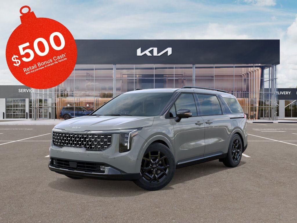 This 2026 Kia Carnival SX CERAMIC SILVER exterior with Navy/Gray interior, has 13 miles. 18city and 26 hwympg